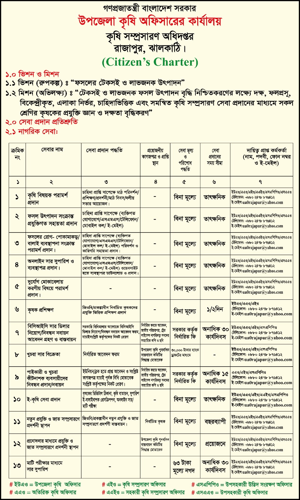 | কৃষি আবহাওয়া, রোগ ও পোকামাকড়ের আক্রমন বিষয়ক সতর্কীকরণ ও পূর্বভাস প্রদান | বিনামুল্যে | প্রয়োজনীয় মুহুর্তে | উপজেলা কৃষি অফিসার ও অধঃসত্মন কৃষি অফিসারগণ |